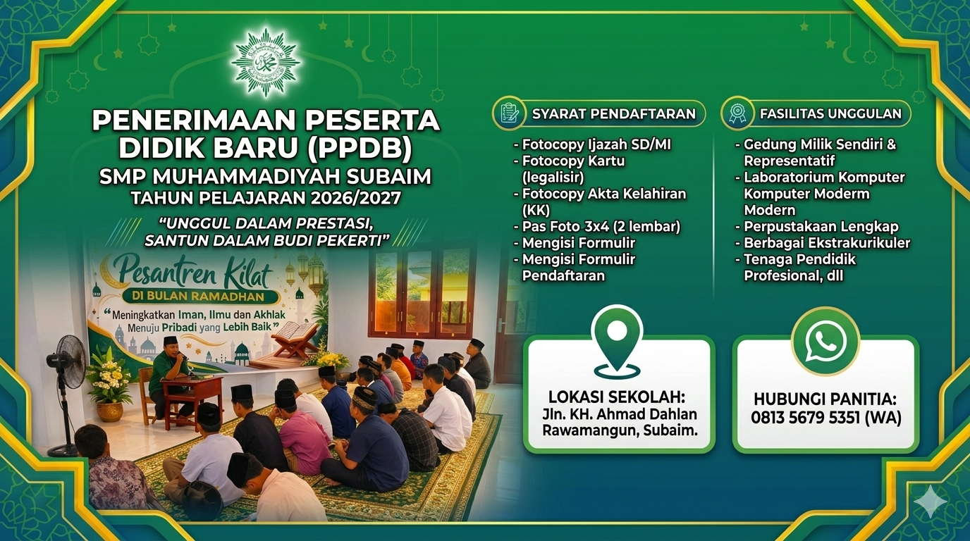 SUBAIM – SMP Muhammadiyah Subaim secara resmi membuka Penerimaan Peserta Didik Baru (PPDB) untuk Tahun Ajaran 2026/2027. Di tengah perkembangan teknologi yang sangat pesat, sekolah ini hadir sebagai solusi bagi orang tua yang menginginkan putra-putrinya tidak hanya cerdas secara intelek